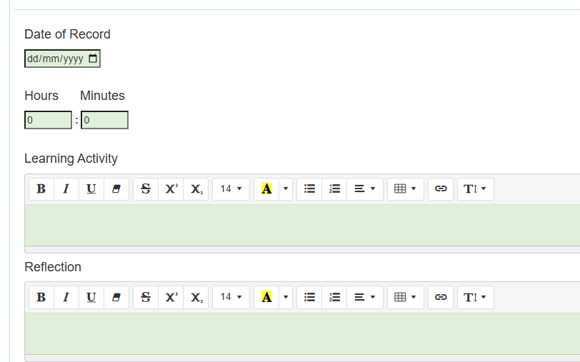 You need to enter the date you undertook the protected learning hour, the actual time taken, a description of the learning activity, and a brief reflection on what you learned. You can split the hour into smaller sections, e.g. half an hour one day and another half an hour later in the week, but you must not take more than one hour each week.