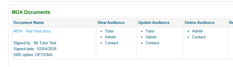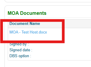 The MOA will now be updated to show who signed the document, the date of signature and the DBS process option chosen.