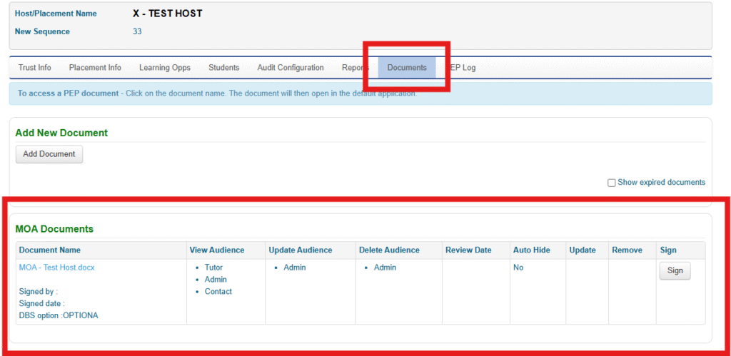 Once you have checked out the PEP Profile, click on the documents tab and then look for the MOA Documents section, which will be located at the bottom of the page.