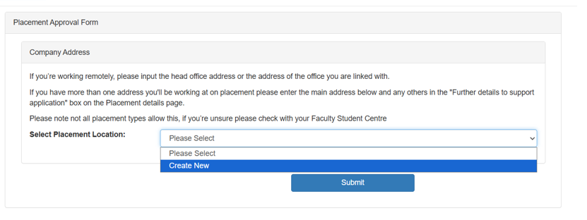 Next, you need to enter the address of the placement. This is a drop-down list; if your placement is already listed, then select it from the list. If your placement is not listed, you will need to add the address. To add a new address, select Create New from the drop-down list and click Submit.
