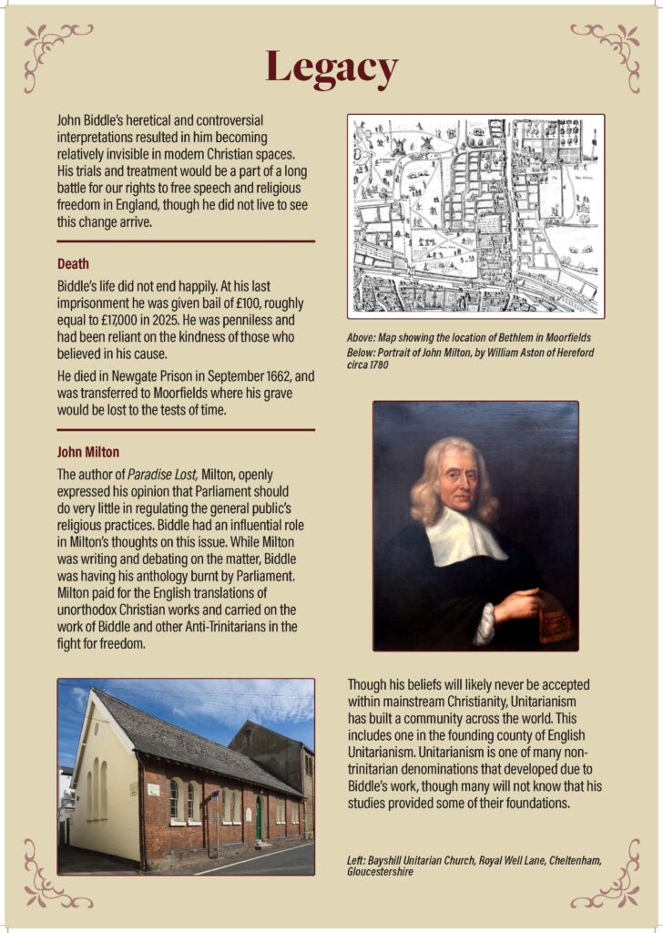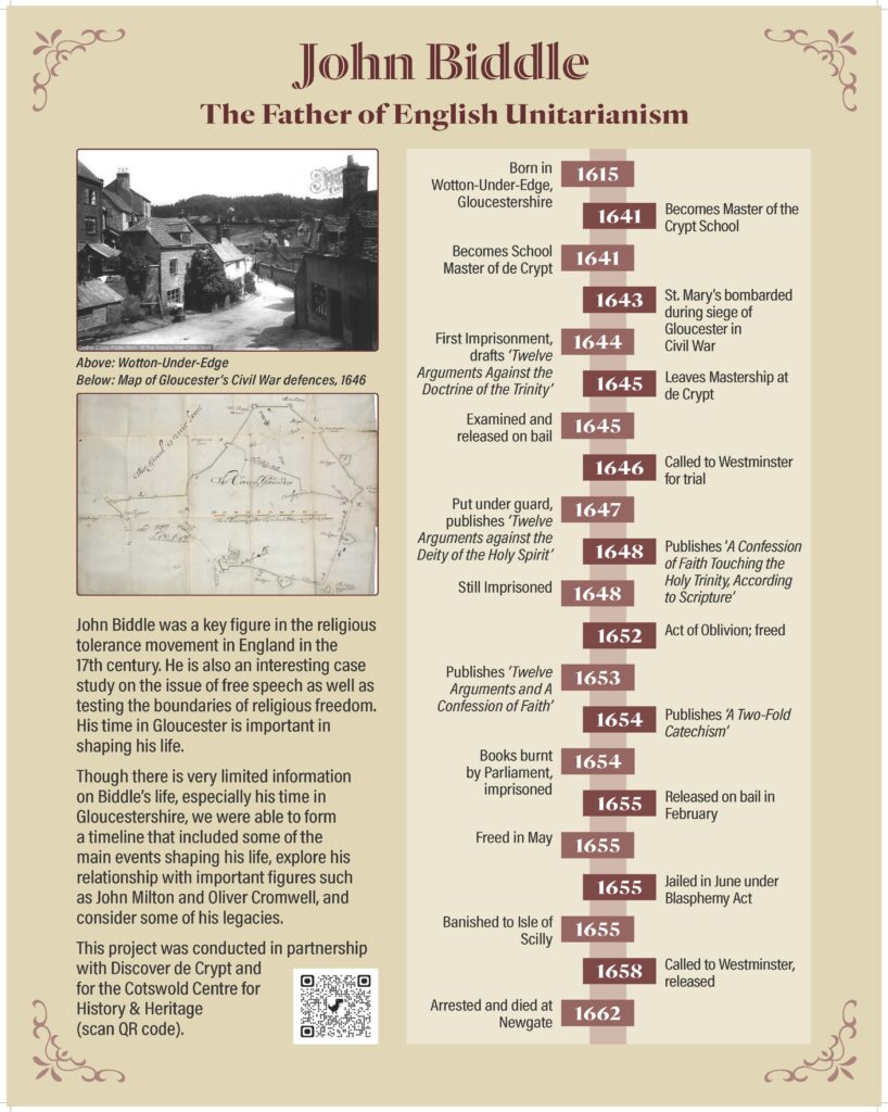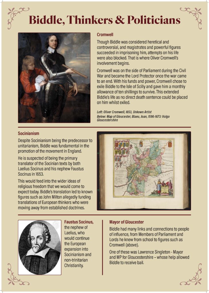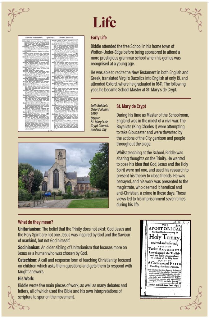 This project was conducted by students Holly Cooke, Fin Pitts, and Wera Kuchta in collaboration with Discover DeCrypt and St Mary’s Church in Gloucester. It explores the hidden life and legacy of of John Biddle who was formerly a Schoolmaster at de Crypt, and was later considered a heretic due to his controversial beliefs. The panels are on display in the old school room at St Mary’s Church in Gloucester.