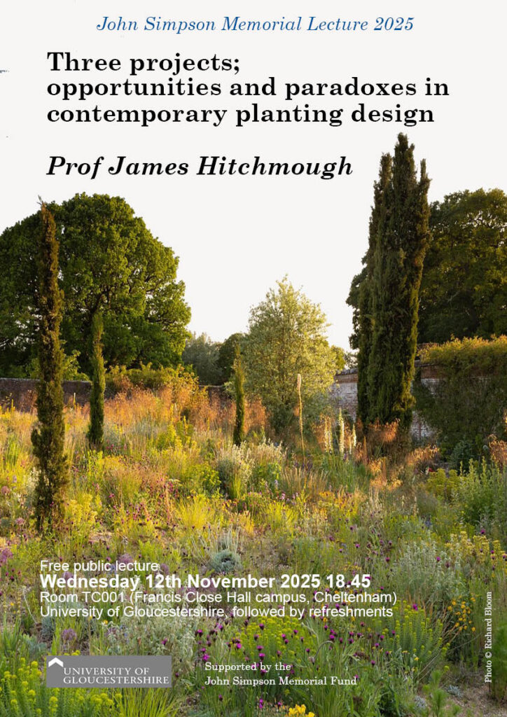 Professor James Hitchmough will give this year’s lecture at 6.45pm on Wednesday 12th November in TC001 main lecture theatre Francis Close campus. All welcome to this free public lecture.