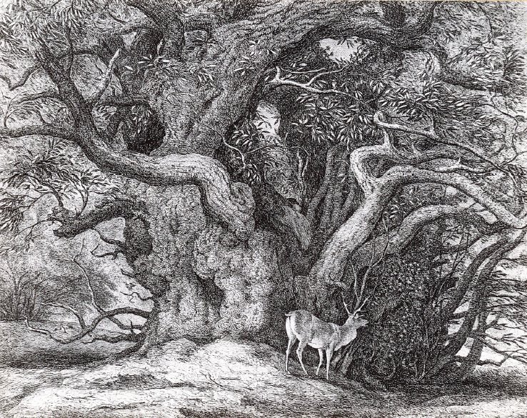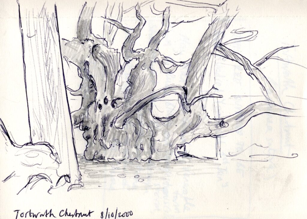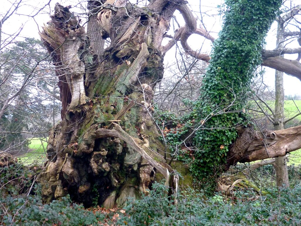 Before 2025 was finished, I visited a “remarkable” tree I first saw 25 years ago. I’d originally seen it named on an Ordnance Survey map of the southern Cotswolds. According to the plaque on site, the sweet chestnut (Castanea sativa) is possibly the oldest planted tree in Britain (by the Romans?), and has been estimated to be 1 to 2000 years old. John Evelyn (English writer and diarist) called the tree “venerable” in 1662 and it was possibly one of several recorded chestnuts in Gloucestershire including the Forest of Dean. In the 19th century Jacob Strutt produced an engraving of it (dated 1826):